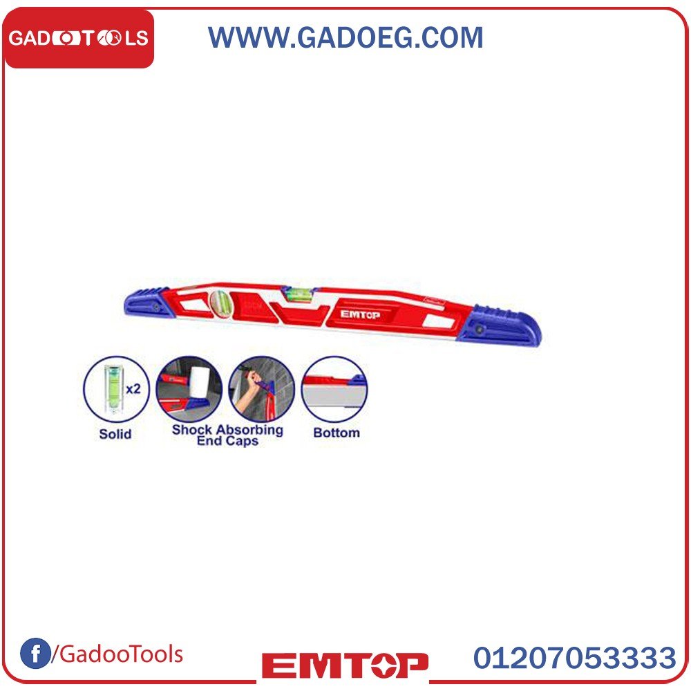 الطول : 60 سم الوزن الصافي: 790 جرام الدقة: 0.5 مم / م السطح السفلي المطحون بدقة والسطح الأمامي هيكل مدبب من الألومنيوم المصبوب شديد التحمل وسادات مطاطية ماصة للصدمات وأغطية طرفية لتحمل ضربات المجرفة وحماية سلامة المستوى فقاعات روح أفقية وعمودية معبأة بأكمام اللون